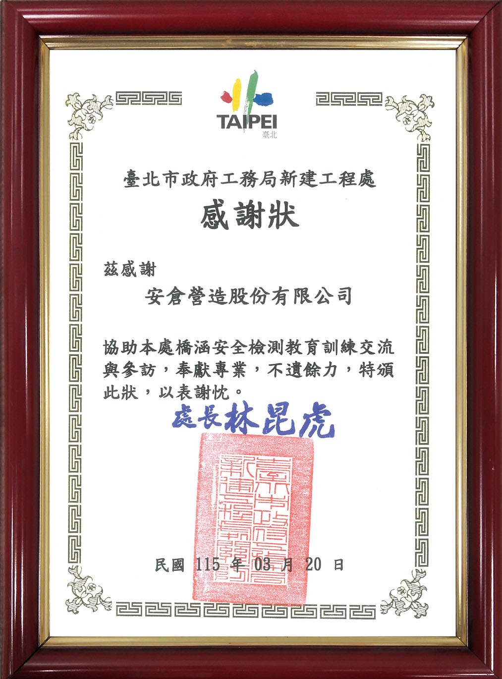 臺北市政府工務局水利工程處感謝狀